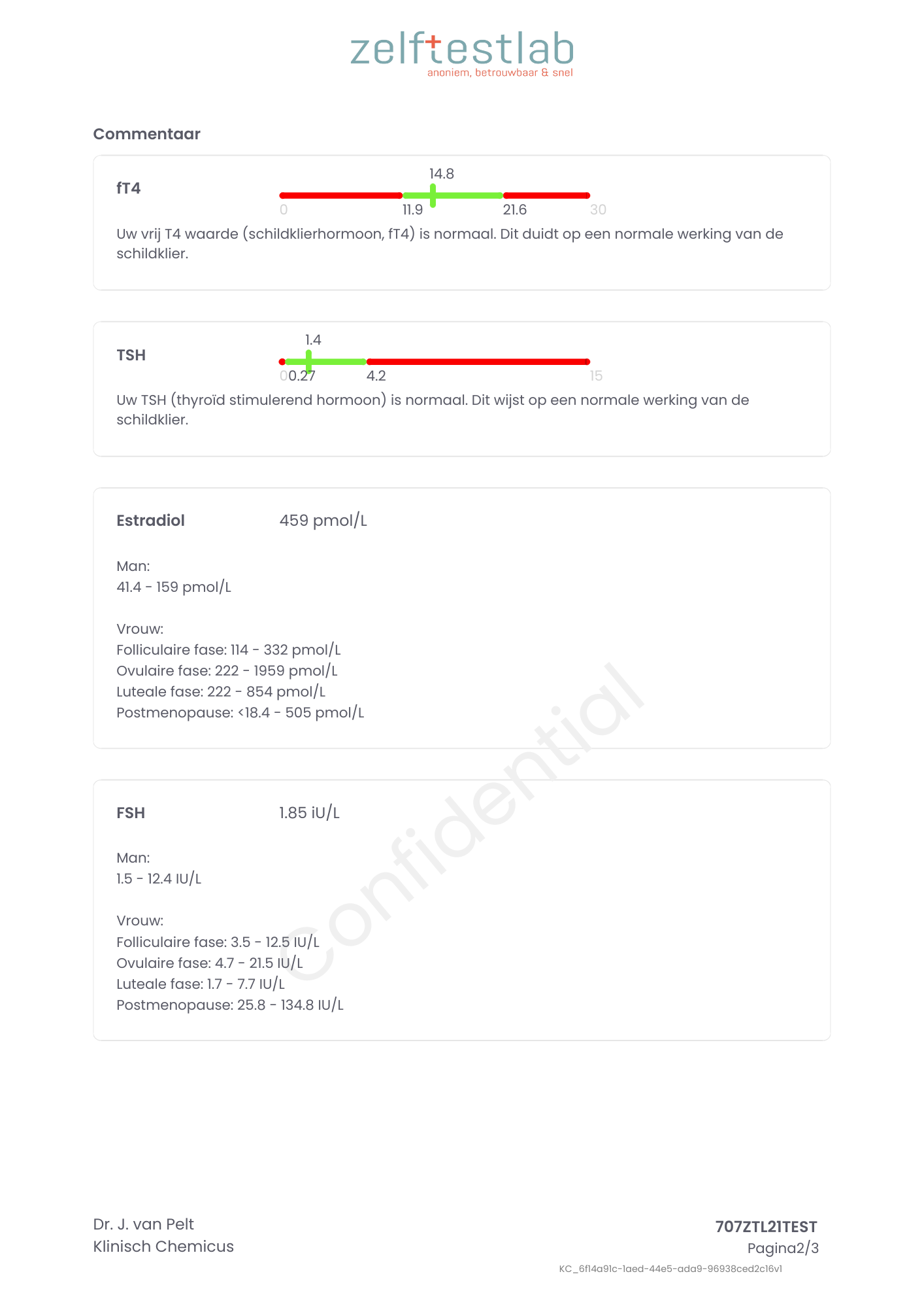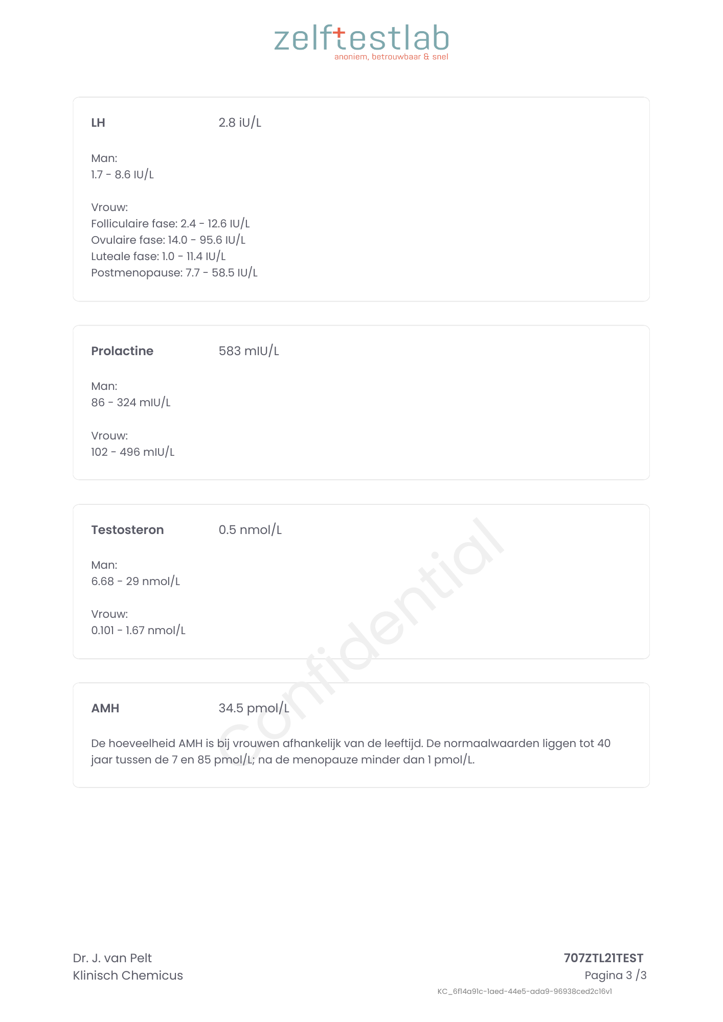 Belangrijk: Voor een nauwkeurige meting is het van belang dat je de test afneemt op dag 3 van je menstruatiecyclus (indien mogelijk), waarbij de eerste dag van je menstruatie telt als dag 1. De afname dient daarnaast plaats te vinden tussen 07.00 en 09.00 uur in de ochtend. Je hoeft hiervoor niet nuchter te zijn. Vermijd wel zware lichamelijke inspanning in de 30 minuten vóór de bloedafname om de betrouwbaarheid van de uitslag te waarborgen.