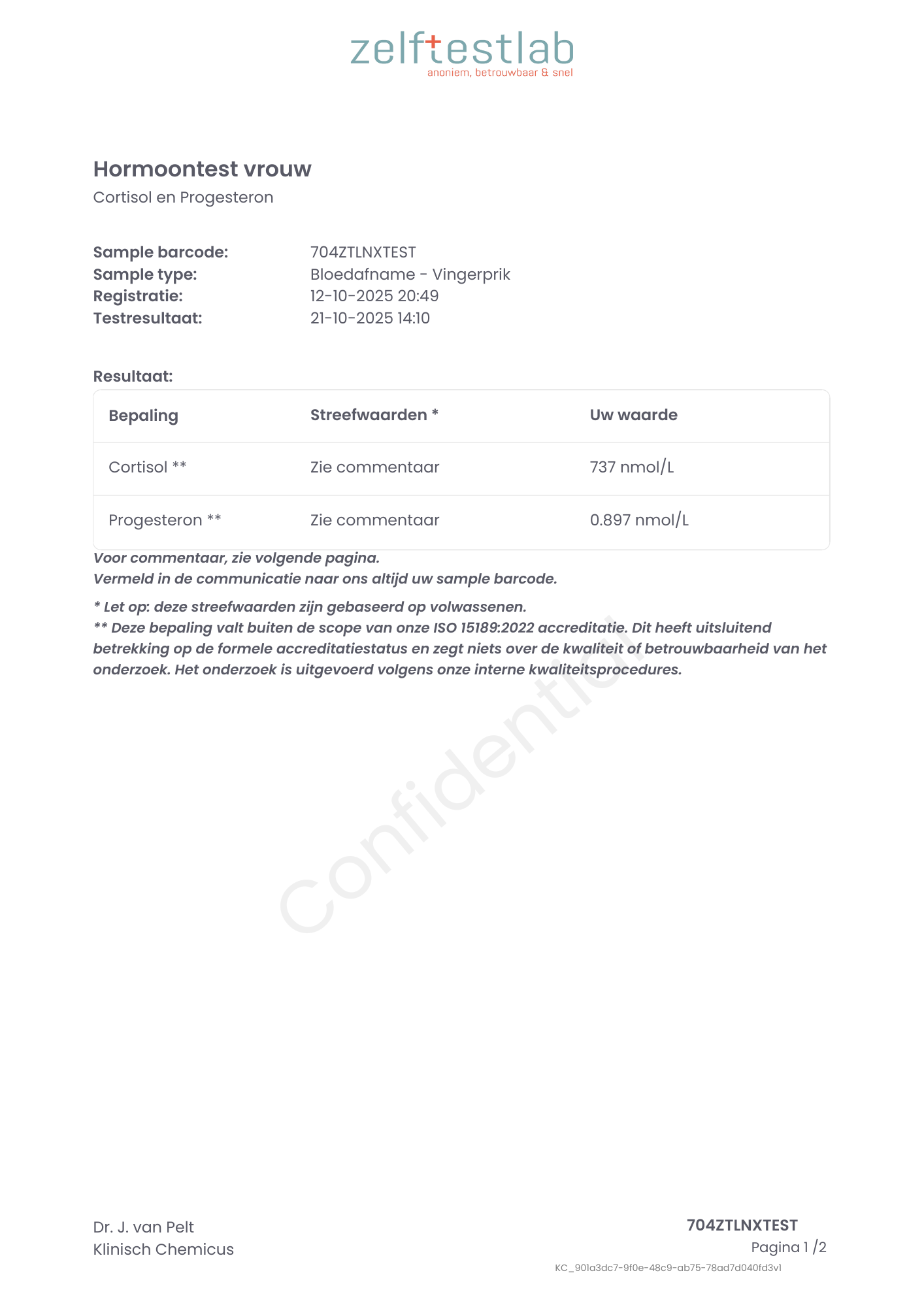 Na het afnemen van de hormoontest vrouw (cortisol & progesteron), stuur je het monster kosteloos terug naar ons gecertificeerde laboratorium. De uitslag is op werkdagen binnen 24 uur na binnenkomst beschikbaar en kan worden bekeken via onze beveiligde app. Kies je voor een bezoek aan onze eigen prikpost, dan zorgen wij dat het bloed rechtstreeks bij ons laboratorium wordt afgeleverd. De uitslag is in dat geval al de volgende werkdag bekend. Een afspraak maken is noodzakelijk, neem hiervoor contact op met onze klantenservice. De resultaten zijn betrouwbaar en worden met de grootste zorgvuldigheid behandeld. Bij een afwijkende testuitslag adviseren wij om je arts te raadplegen voor een juiste diagnose en eventueel verder onderzoek.