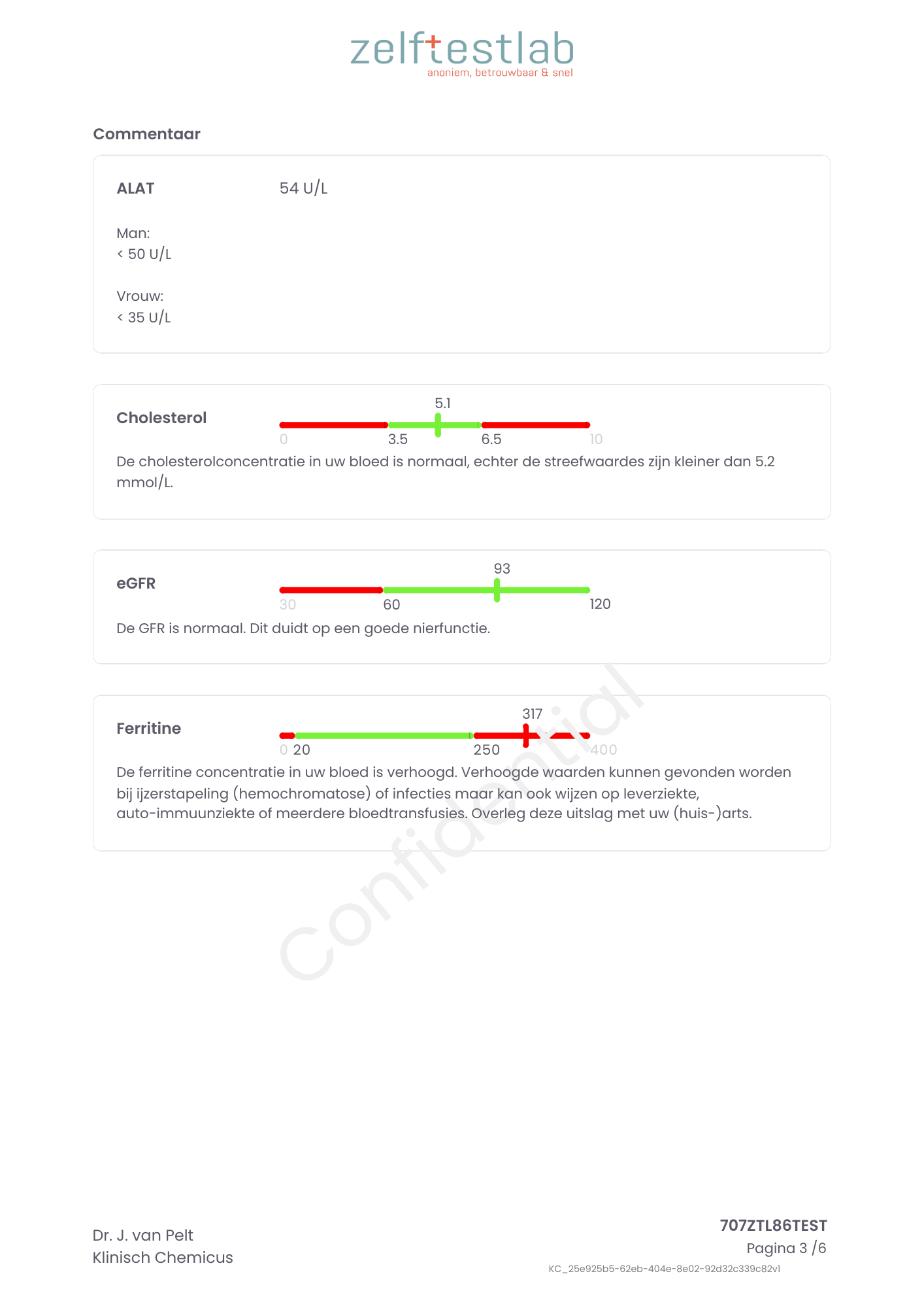 Deze test meet de hoeveelheid ferritine in je bloed. Ferritine is een eiwit dat ijzer opslaat en aangeeft hoeveel ijzerreserves je lichaam heeft. Een lage ferritinewaarde kan wijzen op een ijzertekort, wat kan leiden tot bloedarmoede en symptomen zoals vermoeidheid en duizeligheid. Een te hoge waarde kan duiden op ontstekingen, leverproblemen of een ijzerstapelingsziekte zoals hemochromatose.