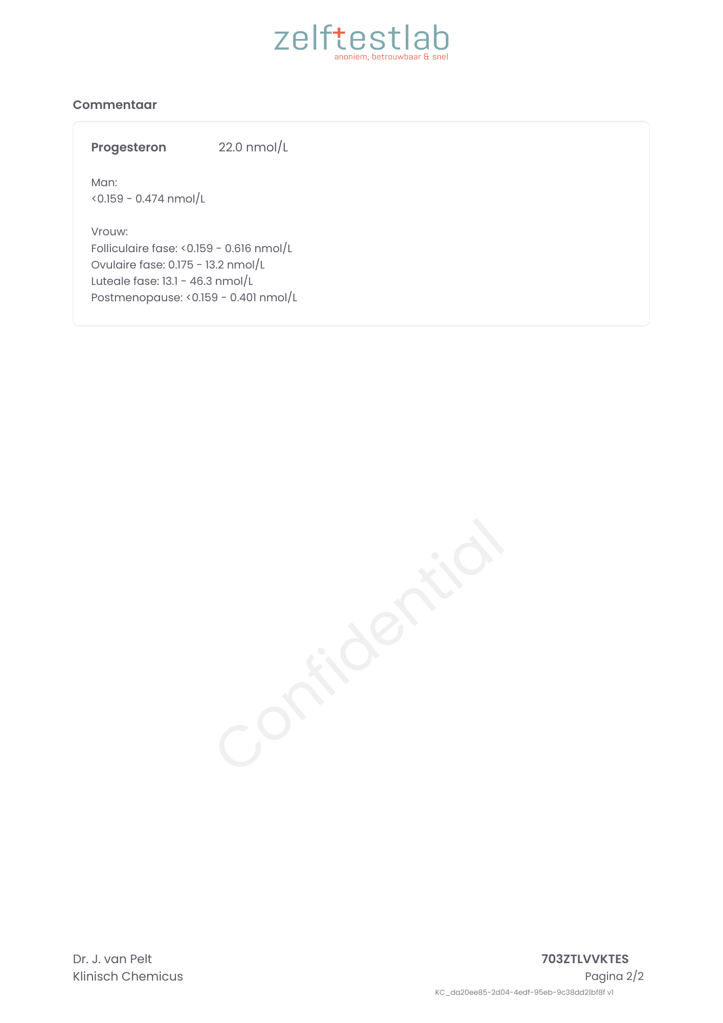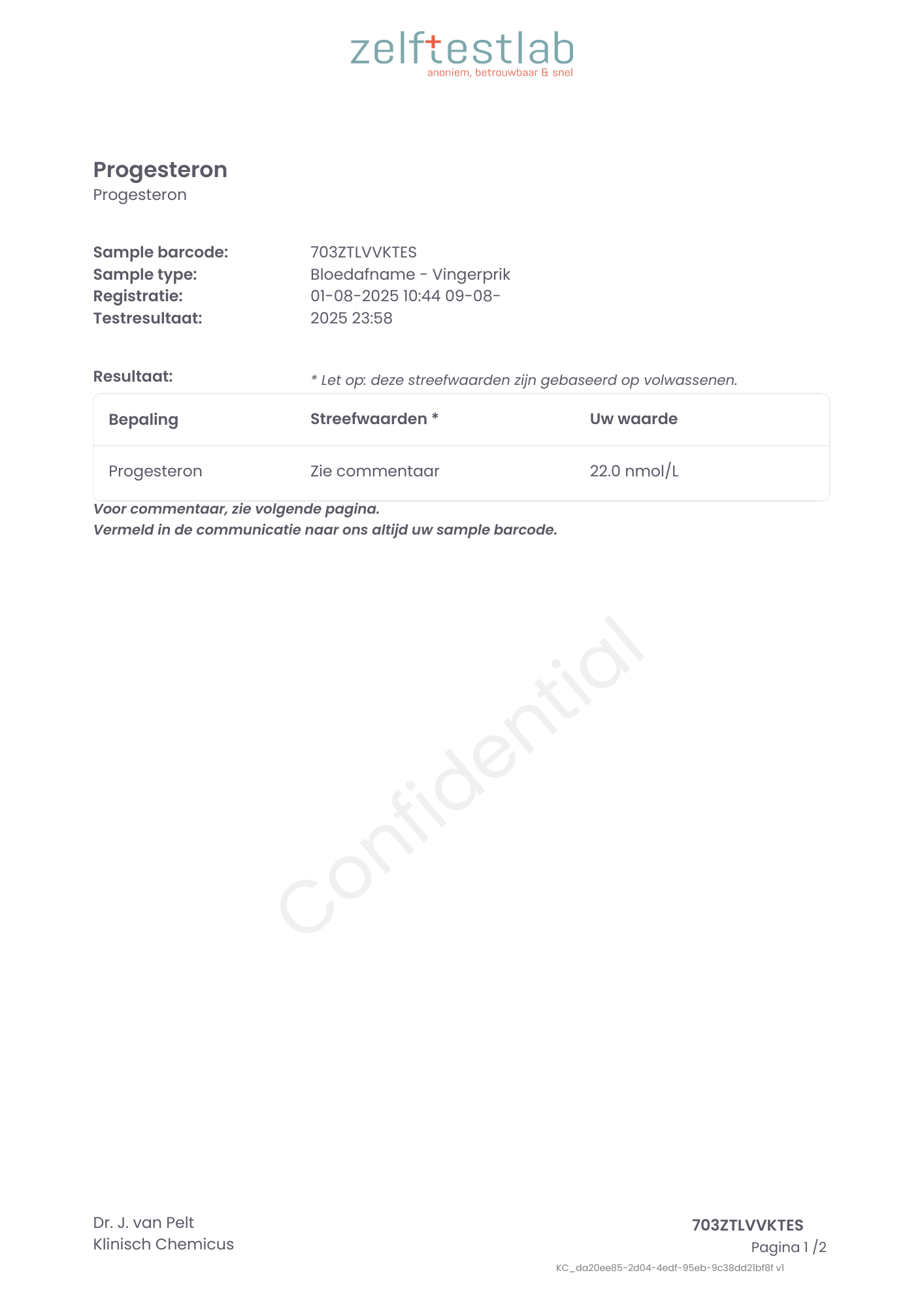 Na het afnemen van de progesterontest, stuur je het bloed kosteloos terug naar ons gecertificeerde laboratorium. De uitslag is binnen 24 uur na aankomst op werkdagen in ons laboratorium beschikbaar en kan worden opgevraagd via onze beveiligde app. Kies je voor een bezoek aan onze eigen prikpost, dan zorgen wij dat het bloed wordt afgeleverd bij ons laboratorium. De uitslag is de volgende werkdag al bekend. Een afspraak maken is noodzakelijk, neem hiervoor contact op met onze klantenservice. Bij een afwijkende testuitslag adviseren wij om je arts te raadplegen voor een juiste diagnose en eventueel verder onderzoek.