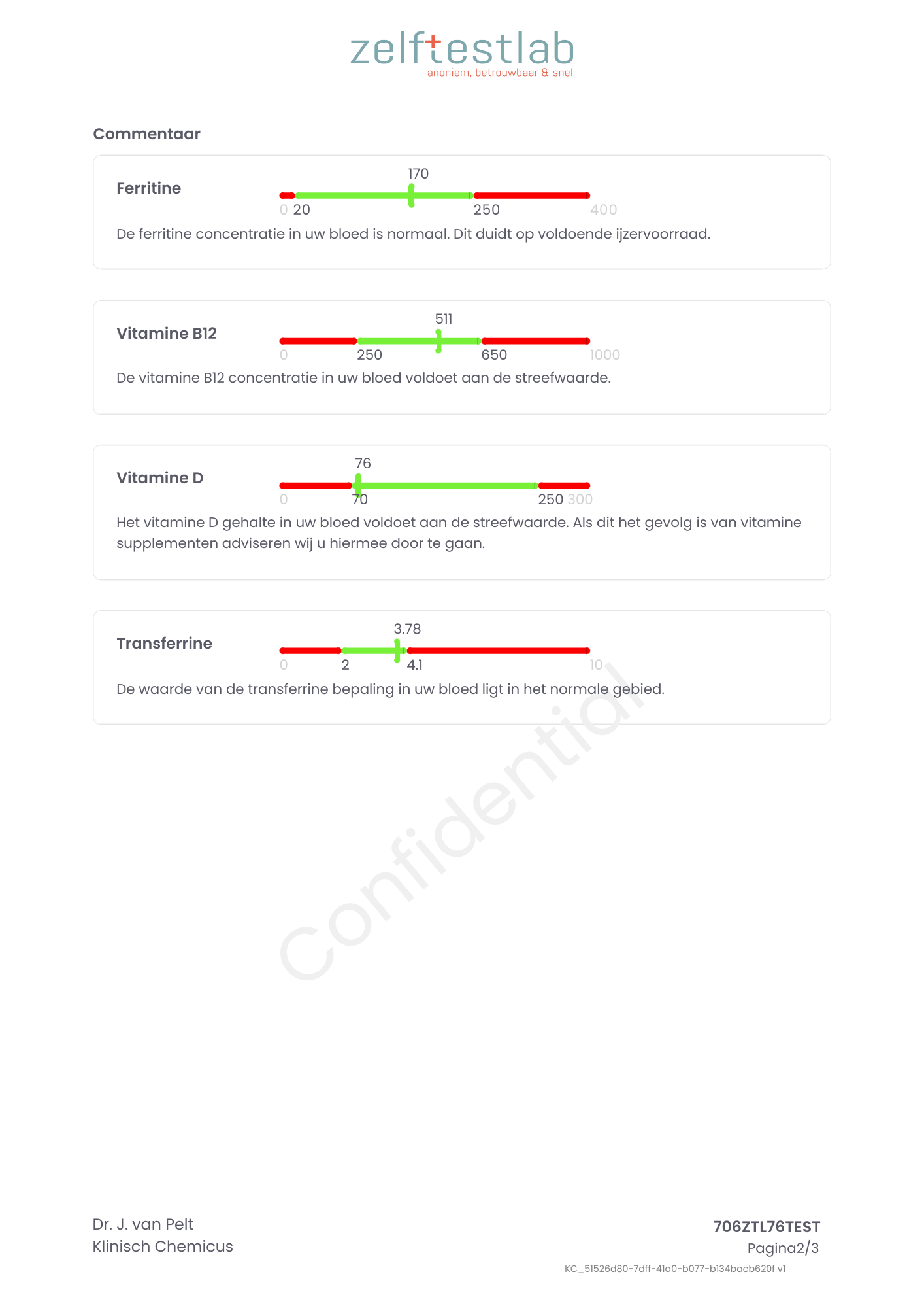 Transferrine is een belangrijk eiwit in het bloed dat zorgt voor het transport van ijzer door het lichaam. Het wordt aangemaakt in de lever en speelt een centrale rol in de ijzerstofwisseling. Wanneer je lichaam ijzer nodig heeft (bijvoorbeeld voor de aanmaak van rode bloedcellen), bindt transferrine het ijzer in het bloed en vervoert het naar organen en weefsels, waaronder het beenmerg. Daar wordt ijzer gebruikt voor de productie van hemoglobine,. het eiwit in rode bloedcellen dat zuurstof transporteert. Een verhoogde transferrinewaarde kan wijzen op ijzertekort (het lichaam probeert meer ijzer op te nemen door meer transporteiwit aan te maken), terwijl een verlaagde waarde kan voorkomen bij chronische ontstekingen, leverziekten of ijzerstapeling (zoals bij hemochromatose). Het meten van transferrine wordt vaak gedaan in combinatie met ferritine (de ijzervoorraad) en serumijzer om een volledig beeld te krijgen van je ijzerstatus.