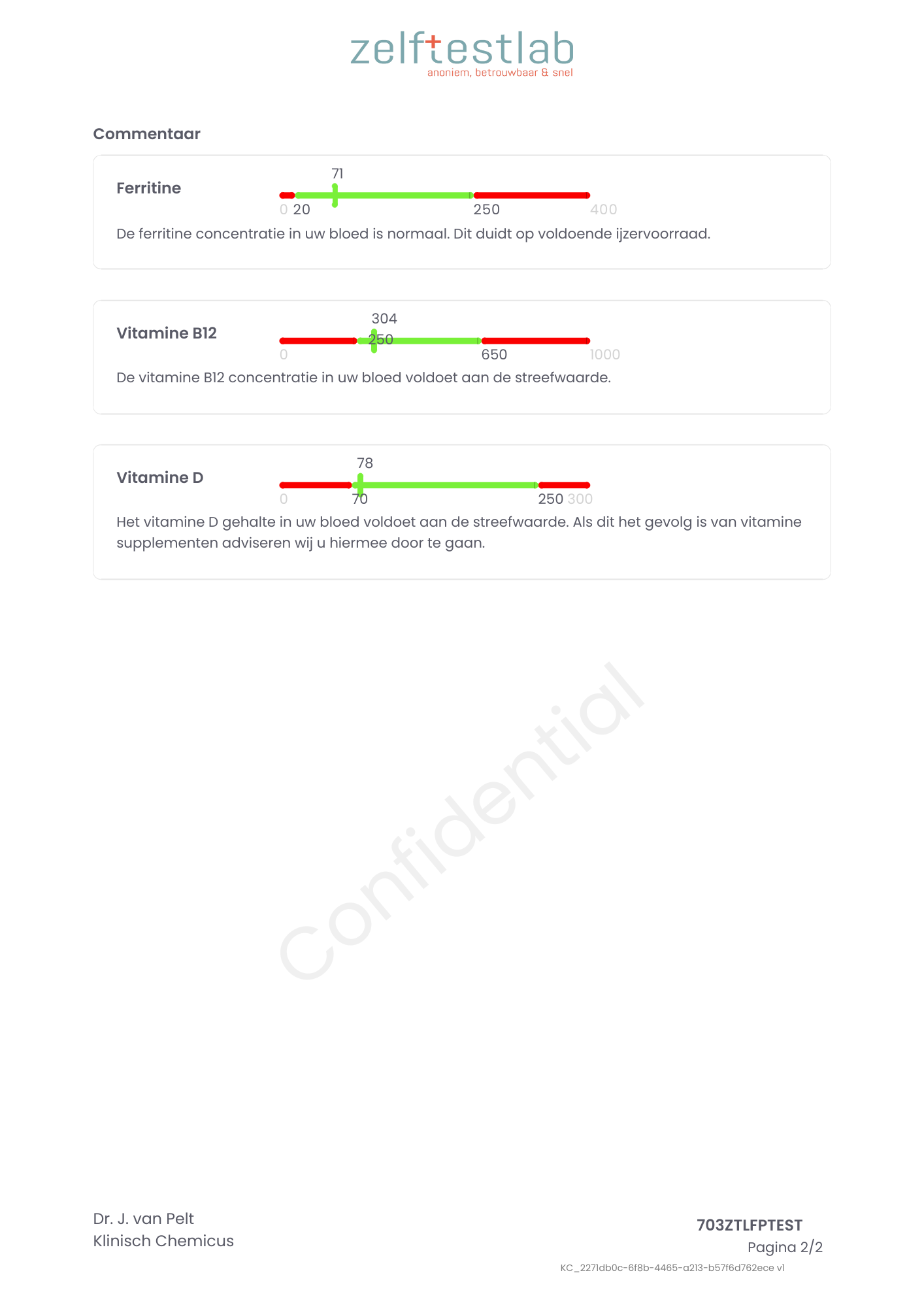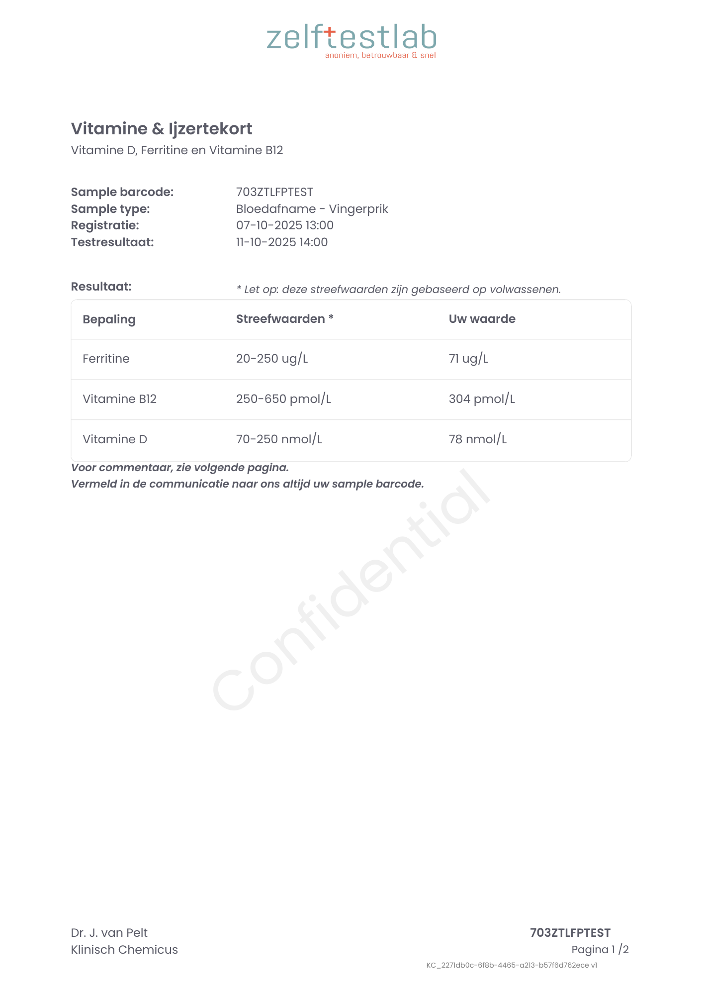 Na het afnemen van de vitamine & ijzertekort test stuur je het monster kosteloos terug naar ons gecertificeerde laboratorium. De uitslag is binnen 48 uur na aankomst op werkdagen in ons laboratorium beschikbaar en kan worden opgevraagd via onze beveiligde app. Kies je voor een bezoek aan onze eigen prikpost, dan zorgen wij dat het bloed wordt afgeleverd bij ons laboratorium. De uitslag is de volgende werkdag al bekend. Een afspraak maken is noodzakelijk, neem hiervoor contact op met onze klantenservice. De resultaten zijn betrouwbaar en worden met de grootste zorgvuldigheid behandeld. Bij een afwijkende testuitslag adviseren wij om je arts te raadplegen voor een juiste diagnose en eventueel verder onderzoek.